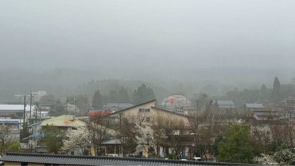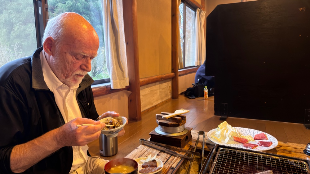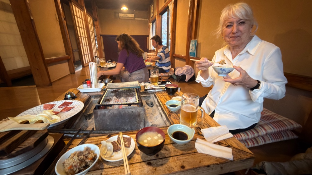 Så spiste vi morgenmad i en flot beliggende sal/restaurant igen med japansk morgenmad med fisk og ris og misosuppe og små pølser og jeg ved ikke hvad. Afsluttende med te og tynd kaffe. Men smukt var der.