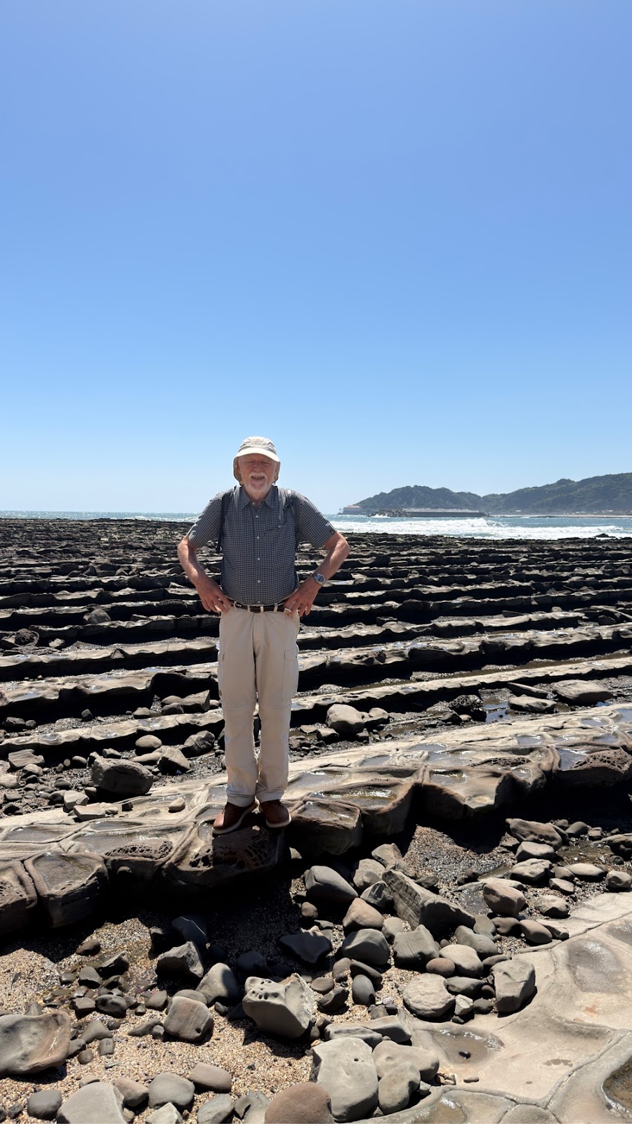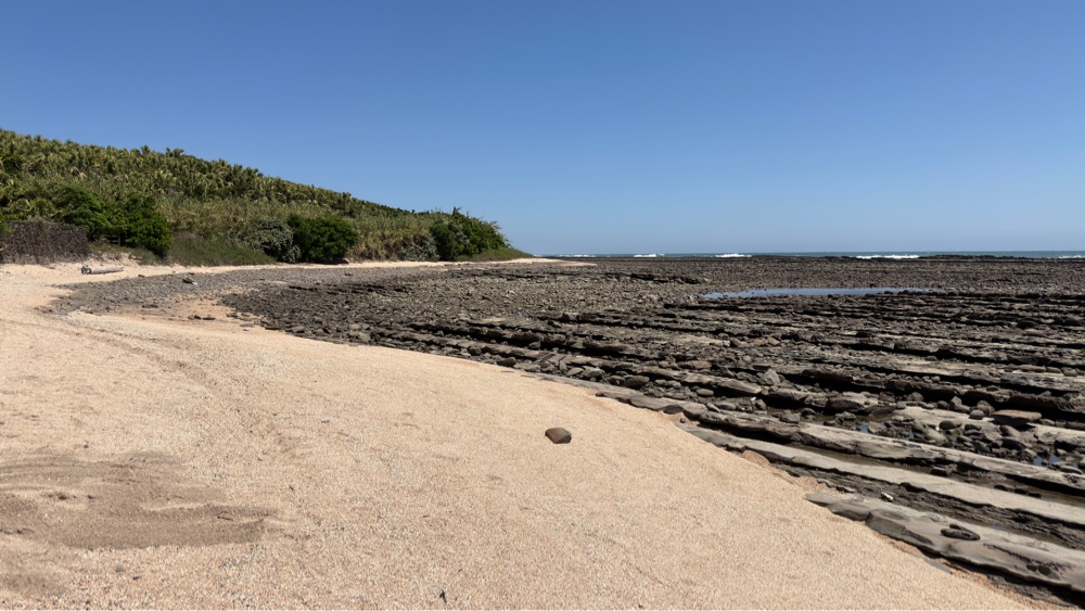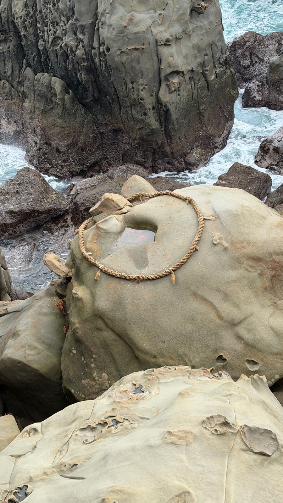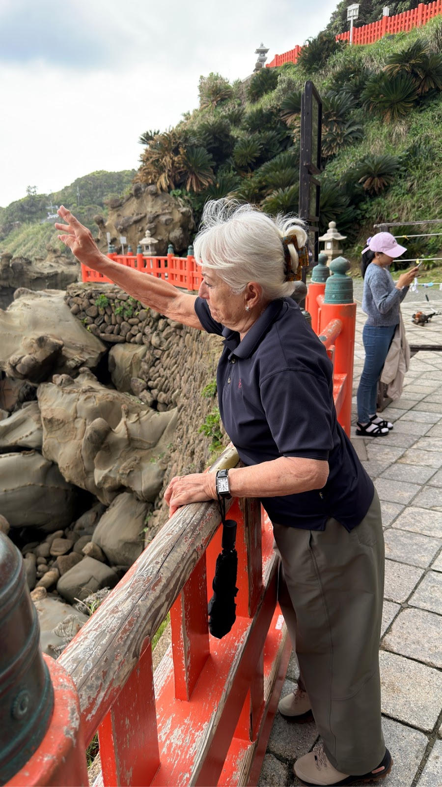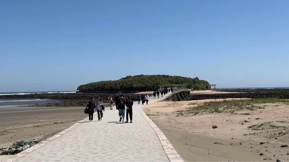 Vi passerede et smukt sted med en meget lang - nærmest dæmning - mellem havet og en lille bugt. Der var ret smukt og Hanne som jo næsten er vandskræk (bortset fra onsen) gik glad over den.