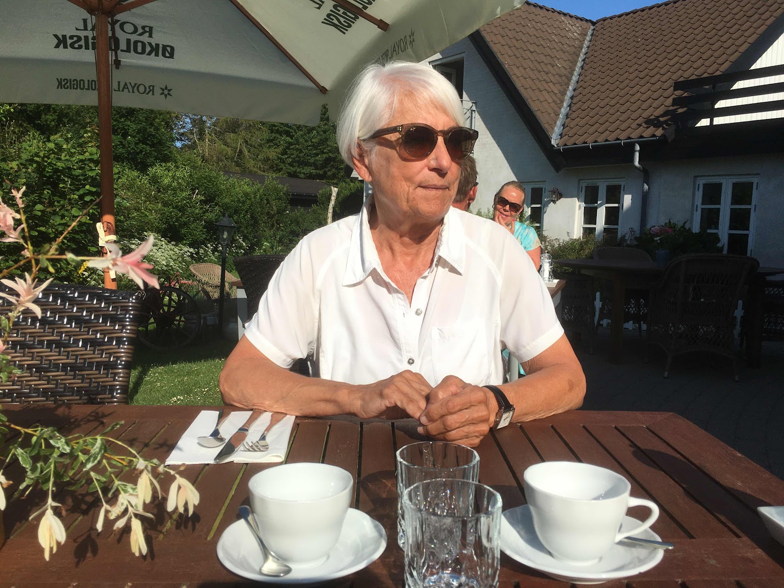 Vi nåede til Hornbæk ved halv 12-tiden og mødte der - ikke helt tilfældigt - Margit og Denis, der var cyklet dertil fra deres nye hjem i Helsingør for at møde os. Det blev svært hyggeligt. Vi fandt et lidt pudsigt sted i Hornbæk, hvor vi fik lidt at spise og drikke inden vi skulle videre mod Helsingør.