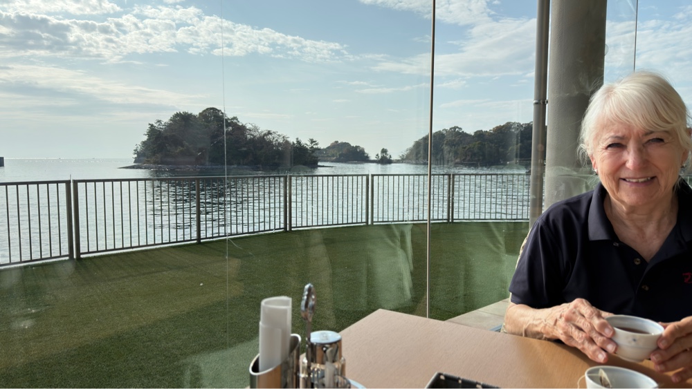 Så spiste vi morgenmad i en flot beliggende sal/restaurant igen med japansk morgenmad med fisk og ris og misosuppe og små pølser og jeg ved ikke hvad. Afsluttende med te og tynd kaffe. Men smukt var der.