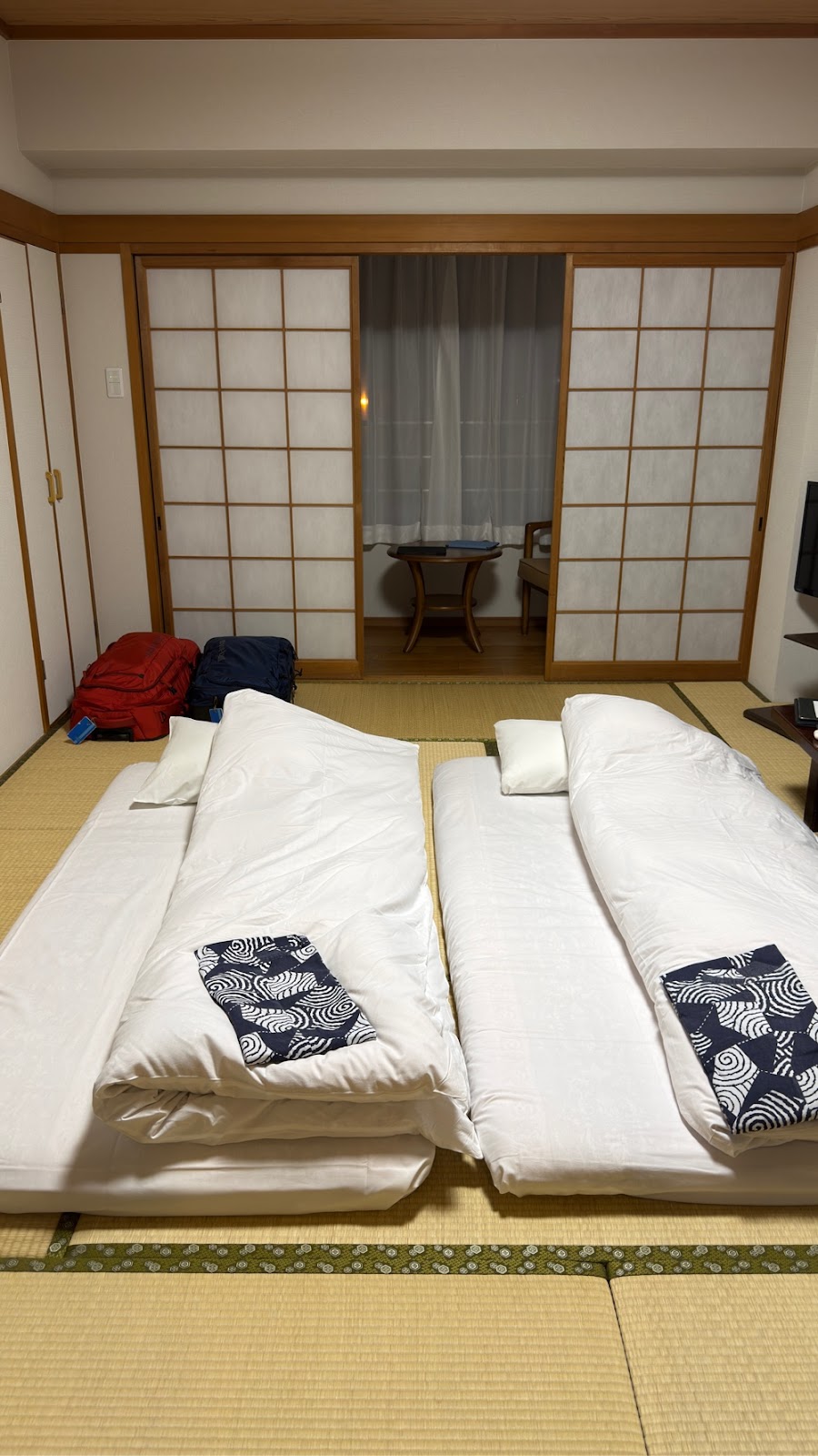 Vi har booket et meget moderne og nyt hotel i Beppu, så det var noget af en overraskelse, da vi opdagede at vi på femte sal i hotellet skulle sove på futons på gulvet. Især fordi vi lige have boet i en ældre ryokan og sovet i “almindelige” senge.