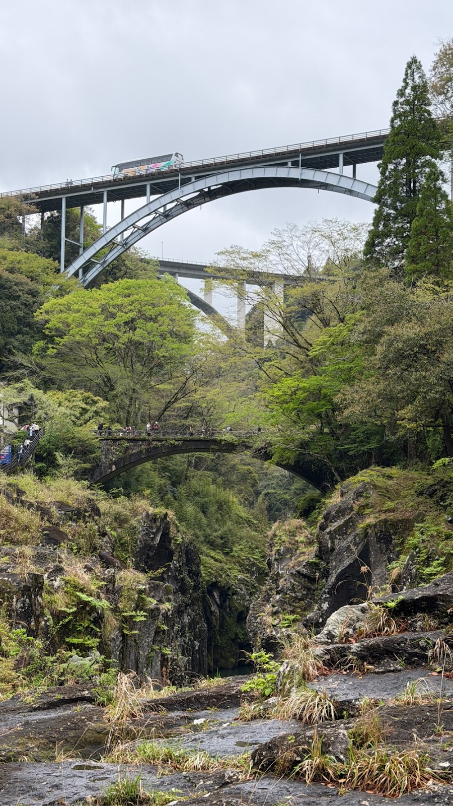 Det var en flot og smuk bustur nede fra Nobeoka ved vandet og op til Takachiho højt oppe i bjergene. Vi så de utroligt mange forskelligt grønne farver på træerne og skovene vi kom igennem. Vi kørte langs en bred flod med mange store broer og vi kørte forbi dybe dale og kløfter. En smuk tur uden fotografier fra bussen. Vejret var desuden ikke særlig godt. Det småregnede os skyerne lå tungt ned over bjergene.